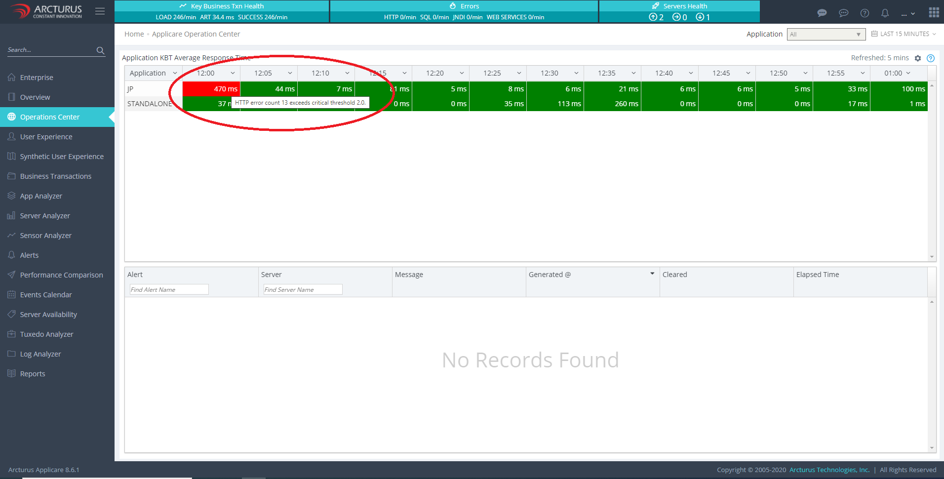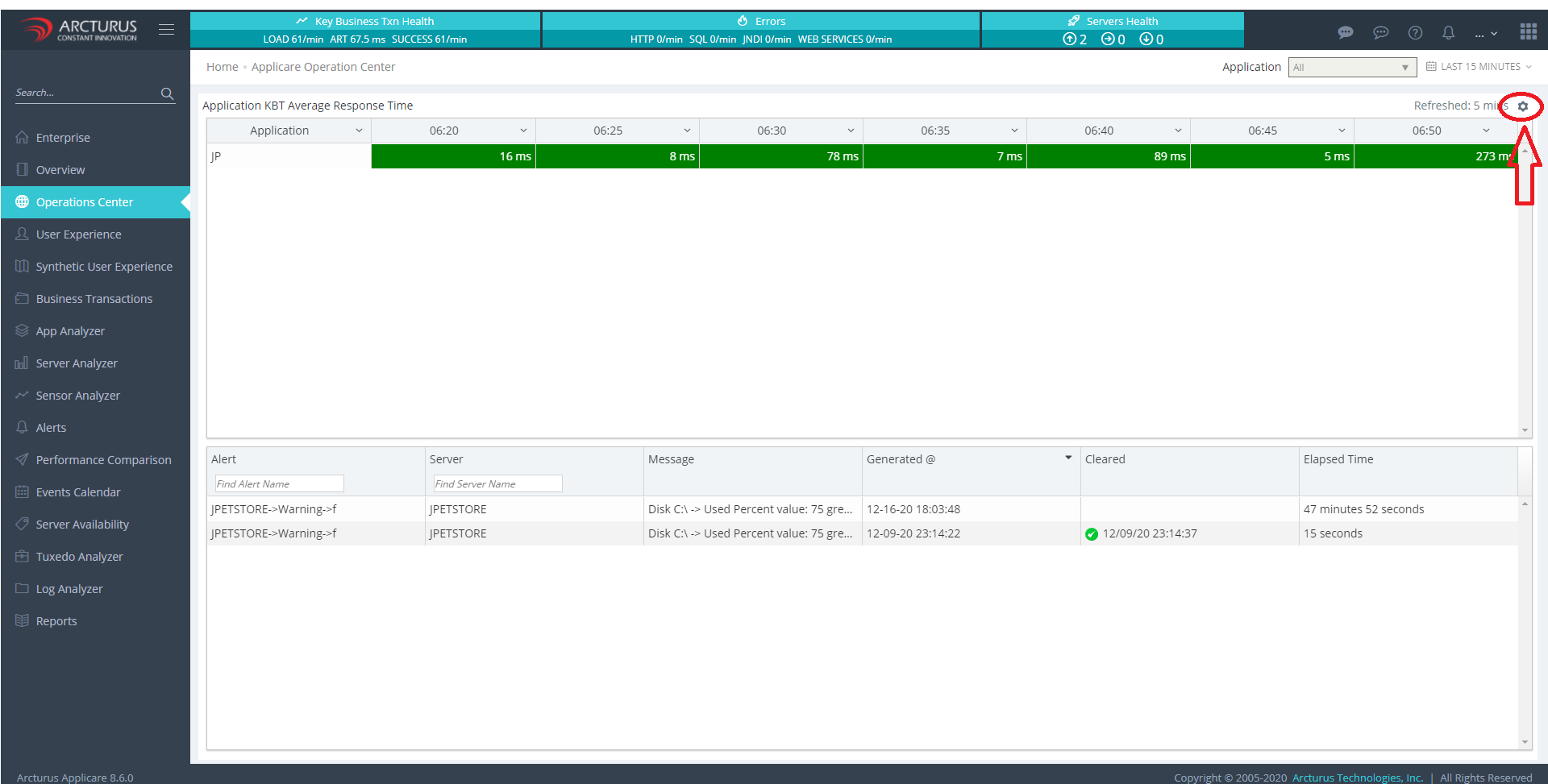The Operation center shows Average Performance Time (ART) of KBT performance based on applications. It displays from last 60 mins data and refreshes automatically every 5 mins.