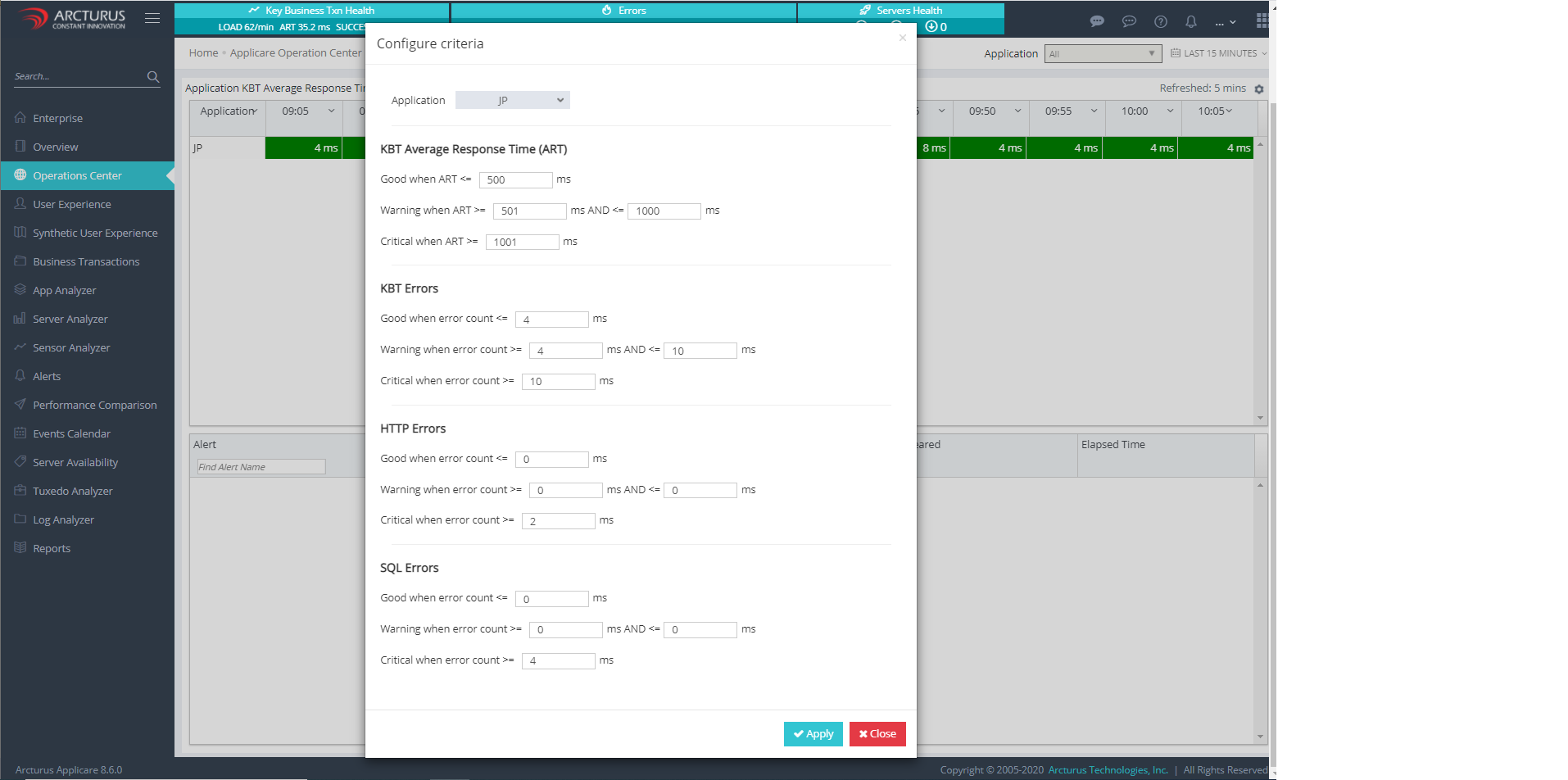 The "Configure Criteria" feature helps users easily differentiate between best, average, and worst performance using color coding. You can set color codes for KBT ART, KBT errors, HTTP errors, and SQL error counts. Values within the good range are shown in green, those in the warning range in yellow, and critical values in red.
