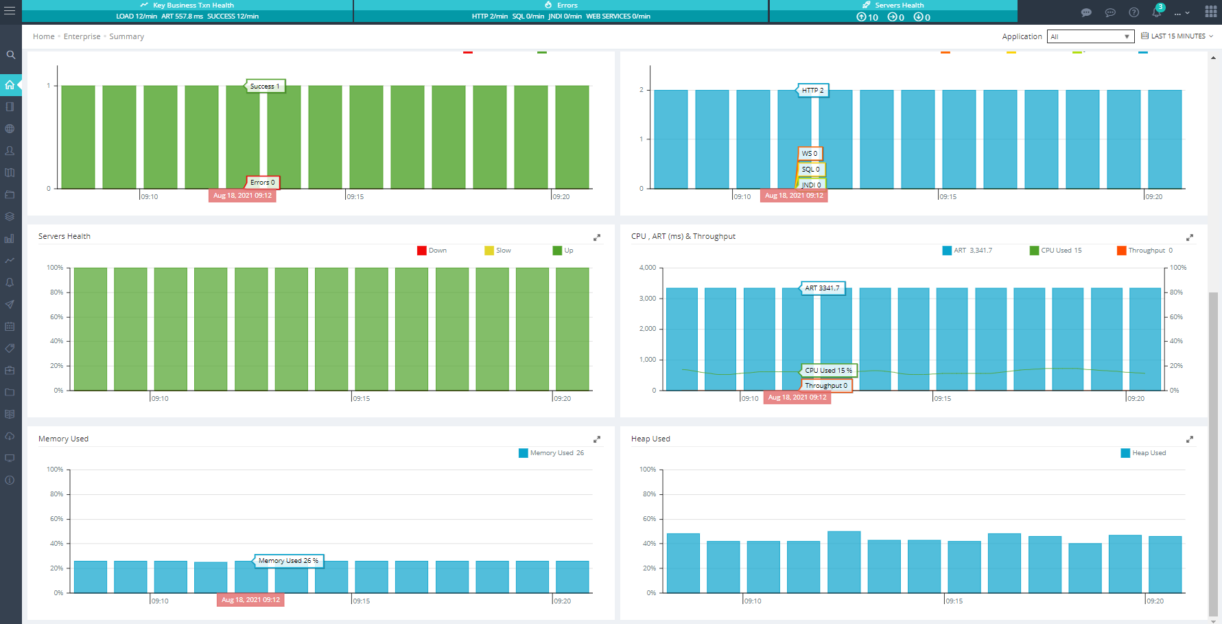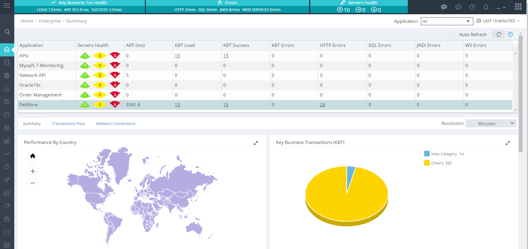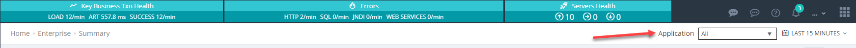 The Enterprise Dashboard provides a quick overview of the health of enterprise applications. It displays the average response time, business transactions, business transaction's load, success/errors, page load performance and health of monitored servers.
