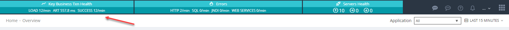 The Business Transactions & Servers Health shows the data for the selected application or all applications if 'All' is selected in application selection dropdown on left.