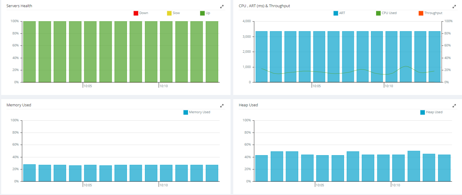 The Enterprise Dashboard offers a clear view of an application's performance with respect to CPU, memory and heap usage. The three charts in the bottom right display cumulative usage by all servers within the selected application. i.e. in the JPetStore application shown below, the three servers each use 6% CPU, 26% memory, and 51% heap.