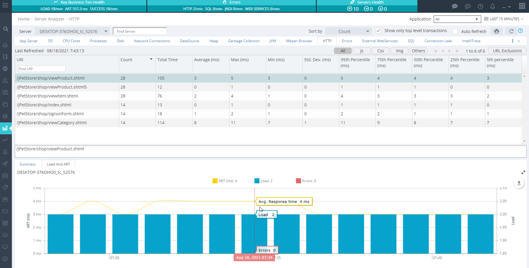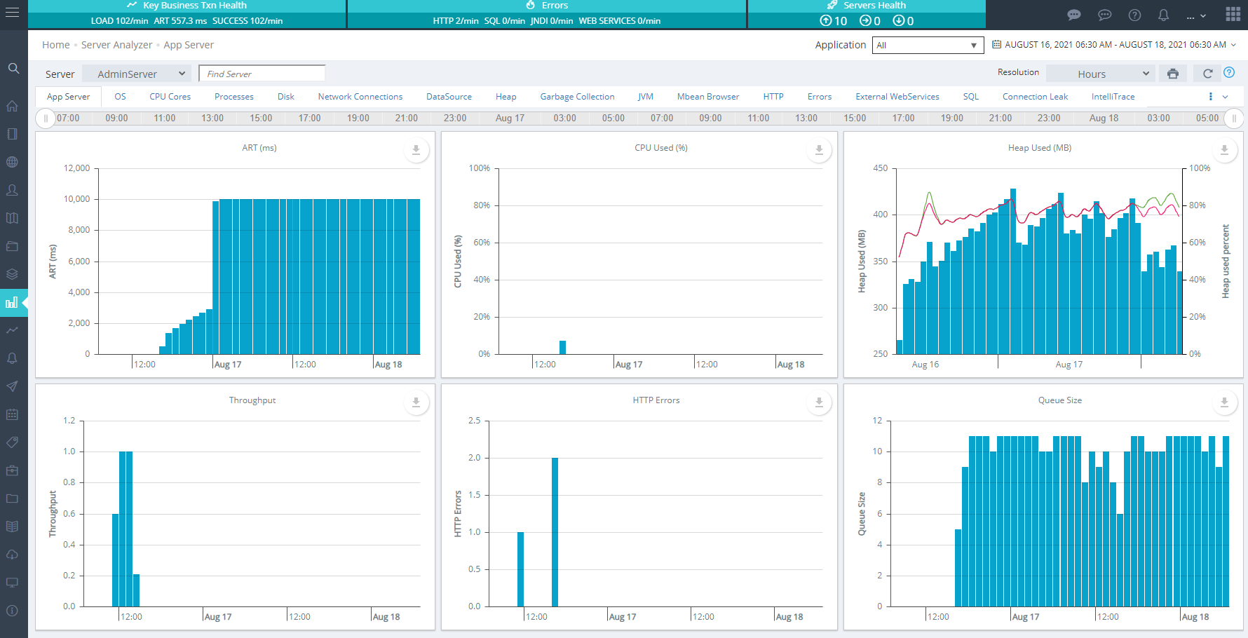 If a time period is selected on top of the home dash then history view is visible. Average Response Time (ART) is a great indicator of a server's performance. A significant increase in ART means things are getting stuck somewhere in the app server. Similarly heap used, throughput, queue size, http errors and CPU used are available.