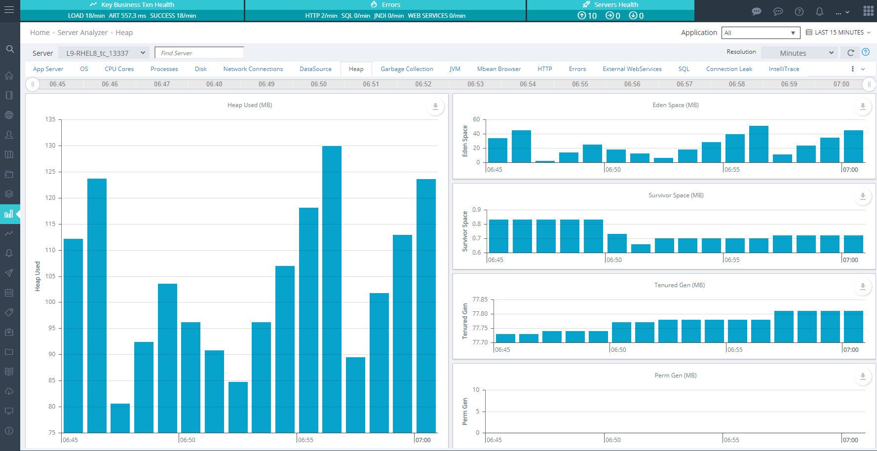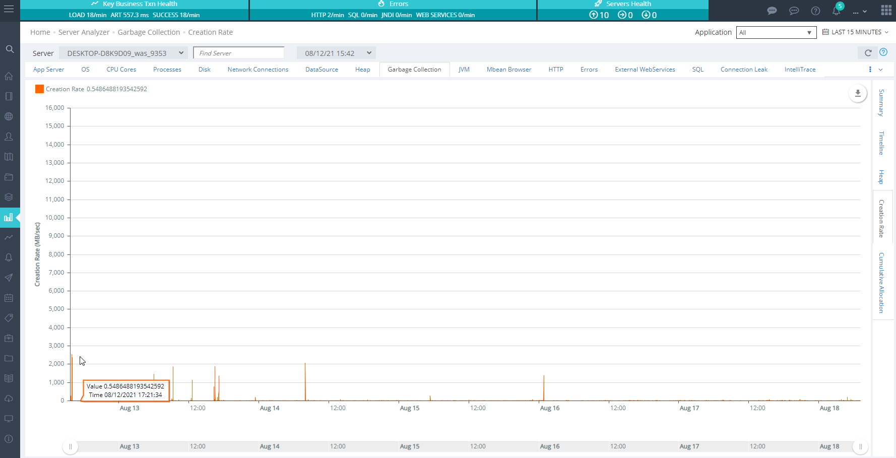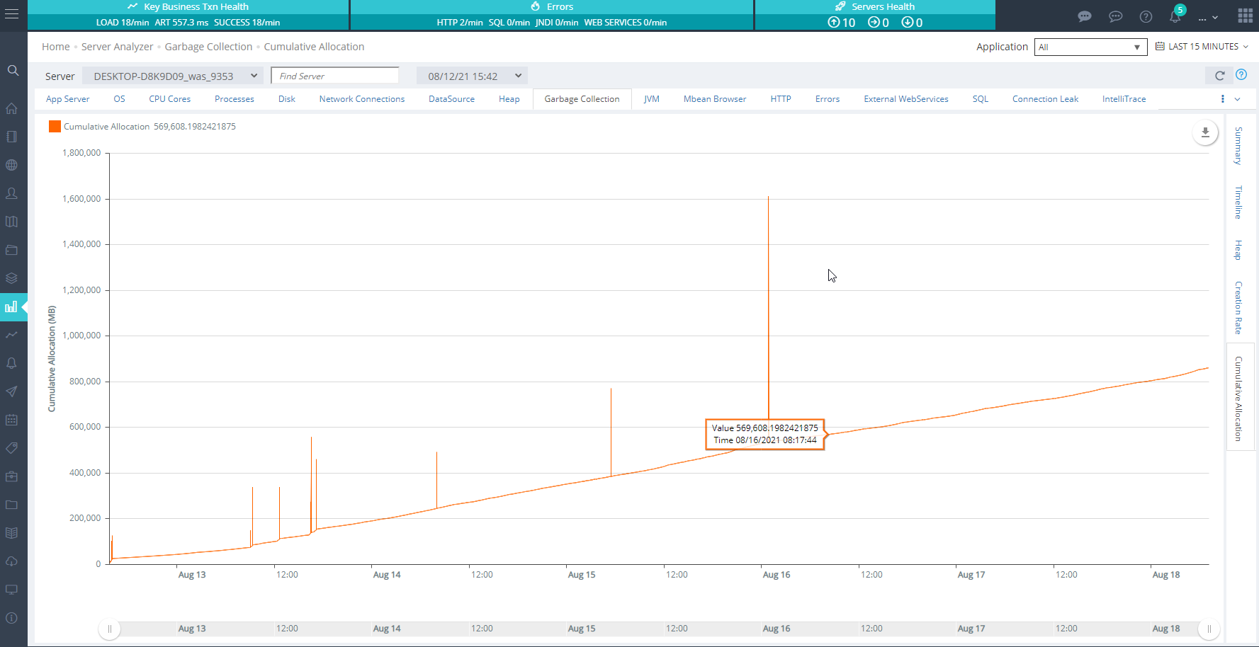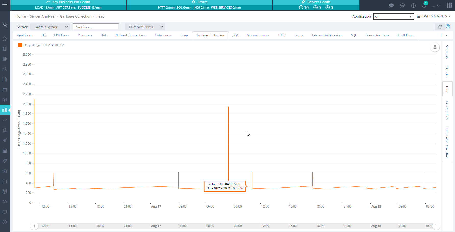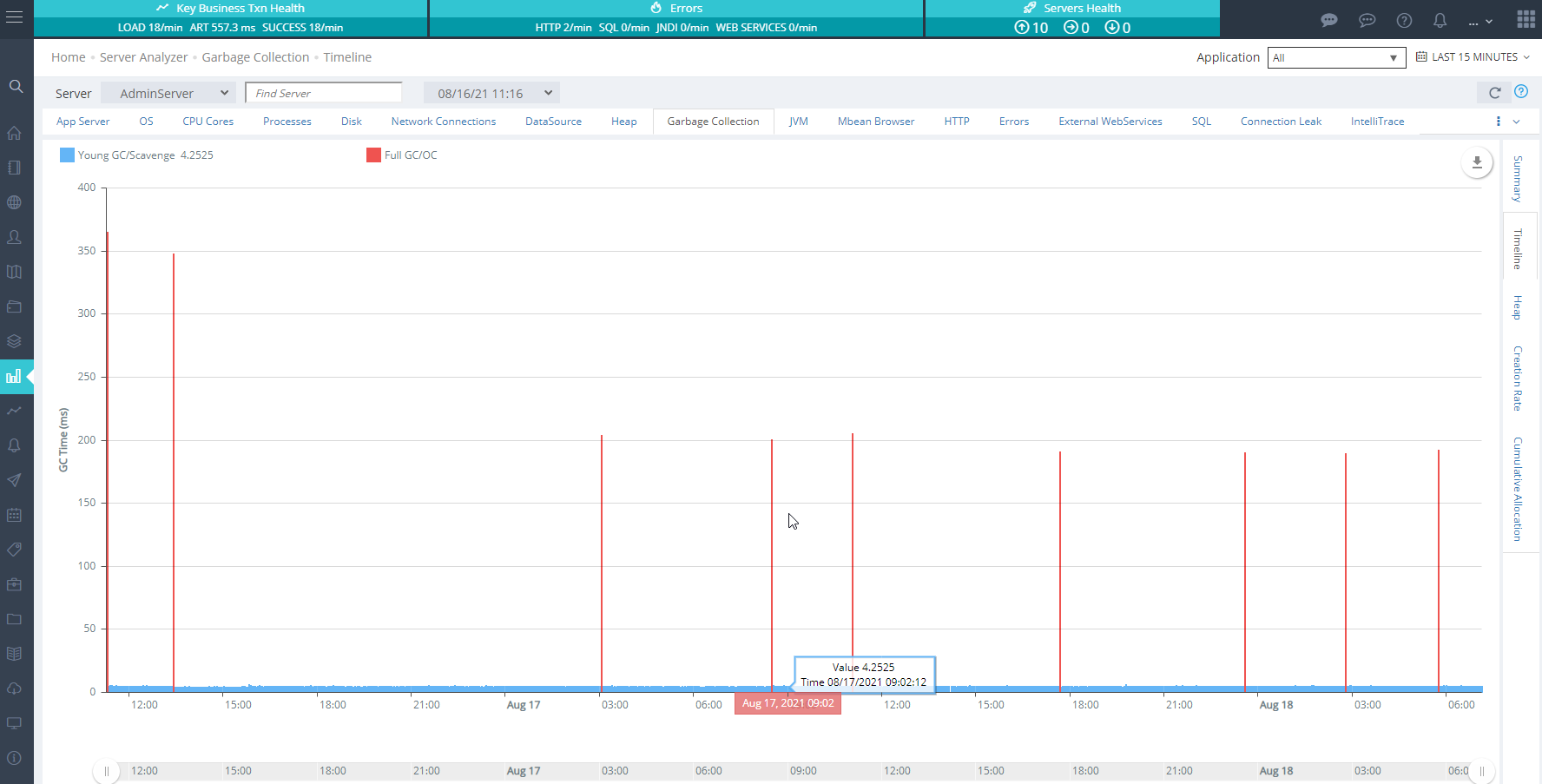 The Heap Analyzer provides a convenient window into the history of your server’s garbage collection and memory allocation behavior. You can zoom in and out, choose the range of days from the drop down, and select which server to display.