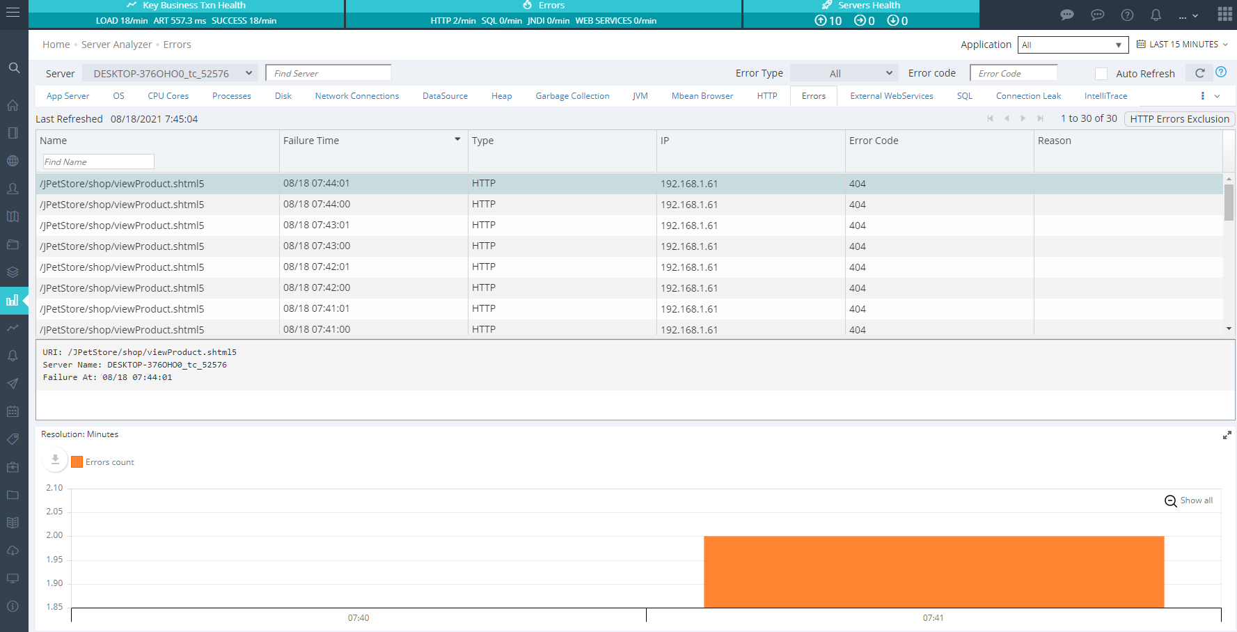 HTTP Errors shows URI, failure time, http error code, exception and IP address where the call came from.