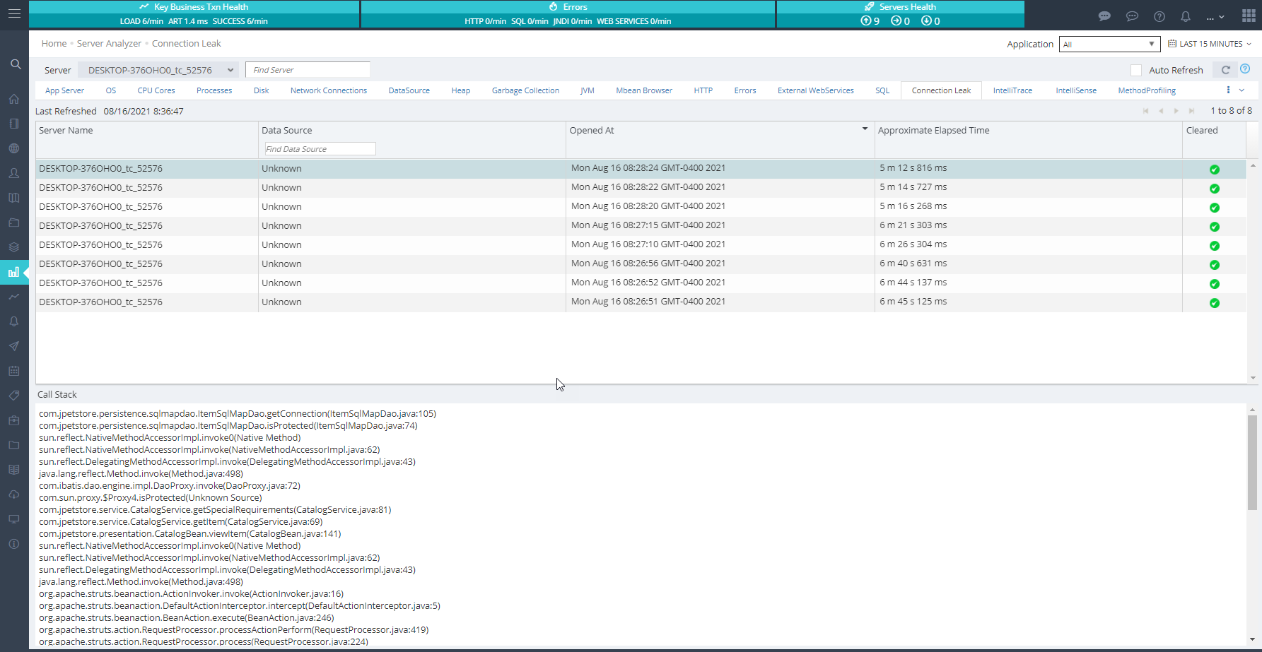 JDBC Connection Profiling feature allows you to detect leaked JDBC connections, connections held open for long periods of time and code responsible for connection leaks. You can view the connections that are currently in open state and clicking on an open connection will display the call stack which requested the connection. Statistics displayed are for the selected server in the UI.