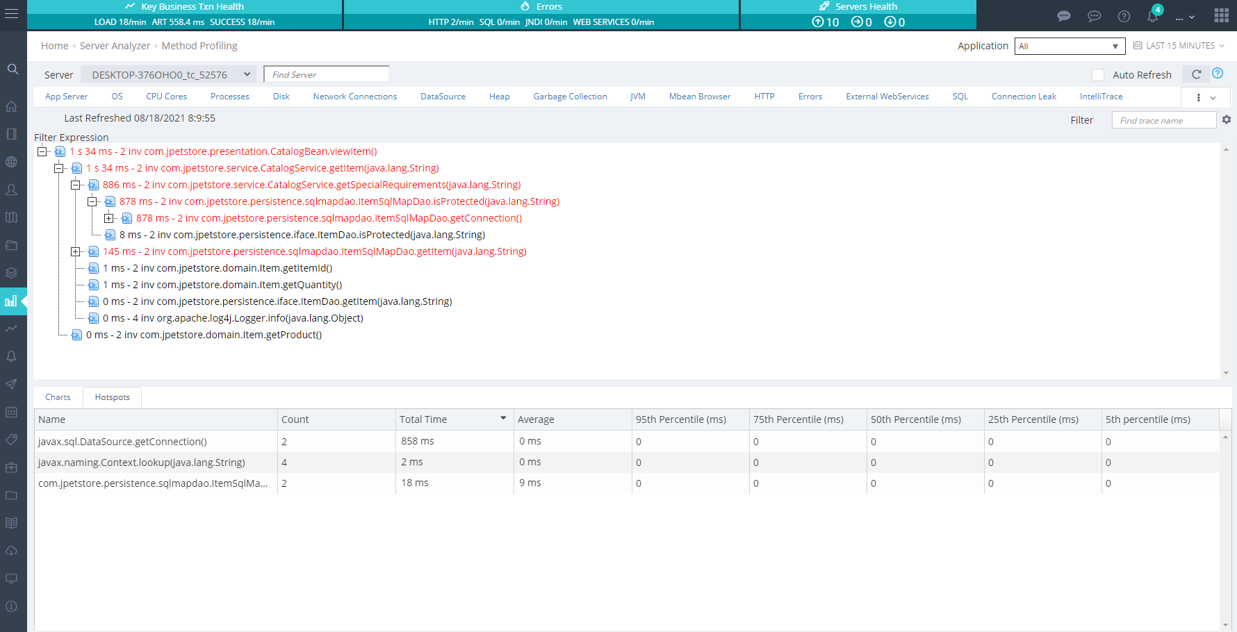 Method Profiling feature allows you to easily view the performance statistics of real-time method executions on-the-fly. This Profiling Aspect needs to be configured and deployed before you can view performance data. See Method Profiling Configuration for more information on configuration.