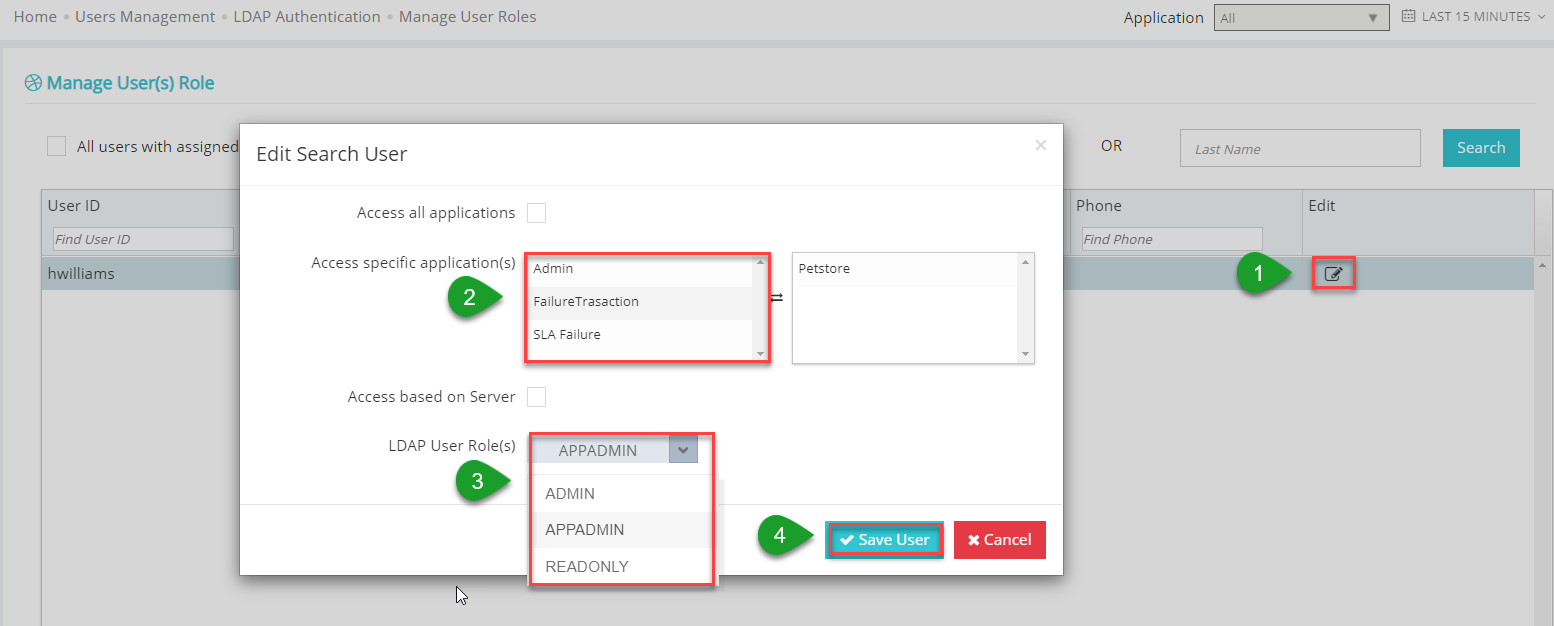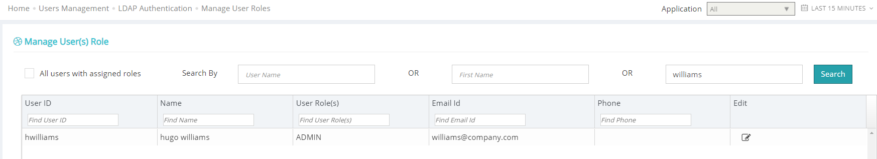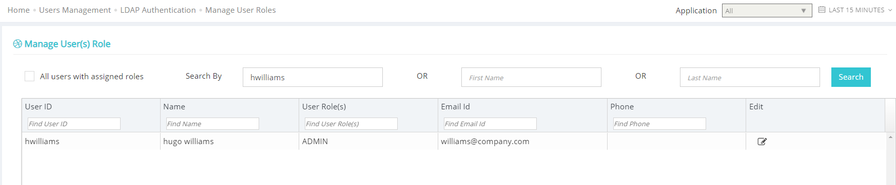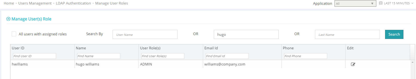 Search for LDAP users by username, first name or last name. The search will retrieve and displays all matching records on this page. You can click the Edit button to assign a role to a user. Applicare supports predefined roles such as Admin or Readonly. You must assign either of these roles to a user in order to provide Applicare access. If readonly access is enabled for all LDAP user, they will have readonly access by default. Only users assigned the admin role in Applicare will have admin access.