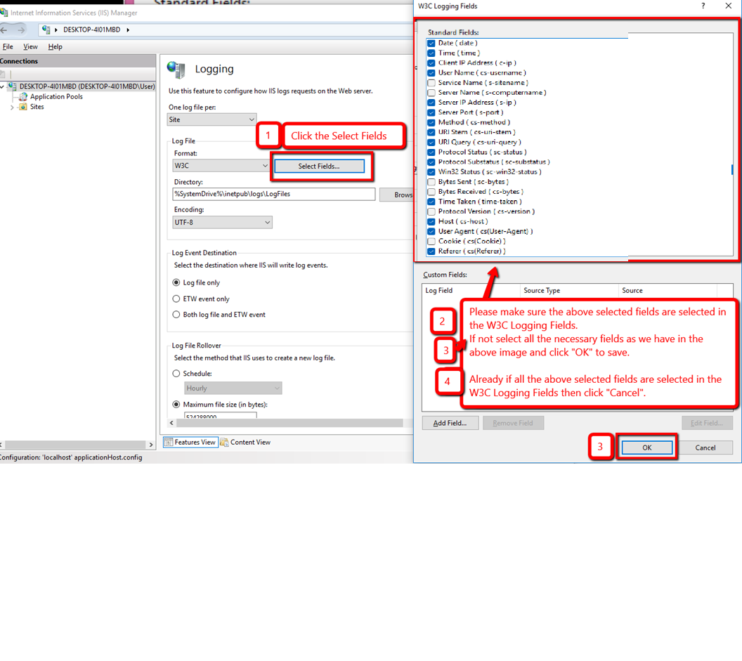 4. Please make sure the below specified W3C Logging Fields are enabled in the same format. Other than the below-enabled fields no other fields should be enabled.