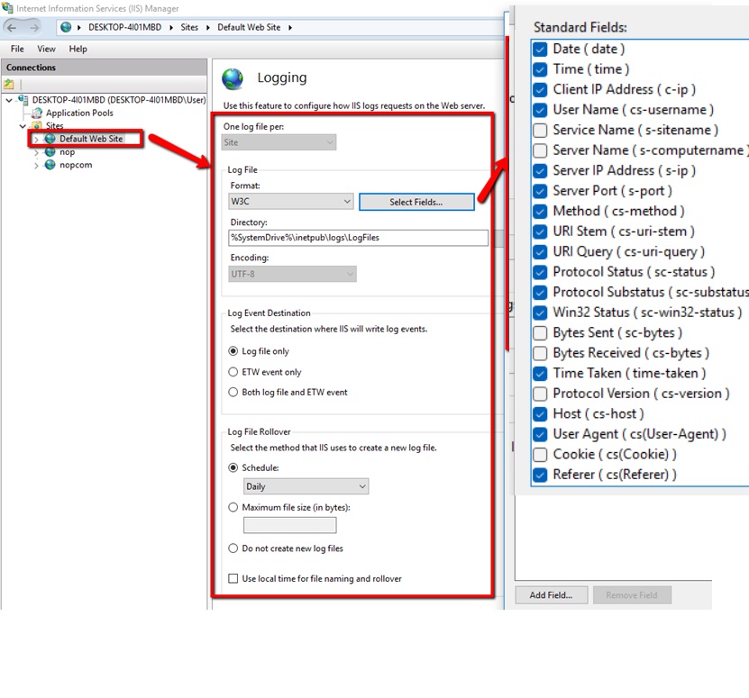 6. Select the site and double click the Logging option and check the Logging and W3C Logging Fields for that site. Likewise check for other sites as well.