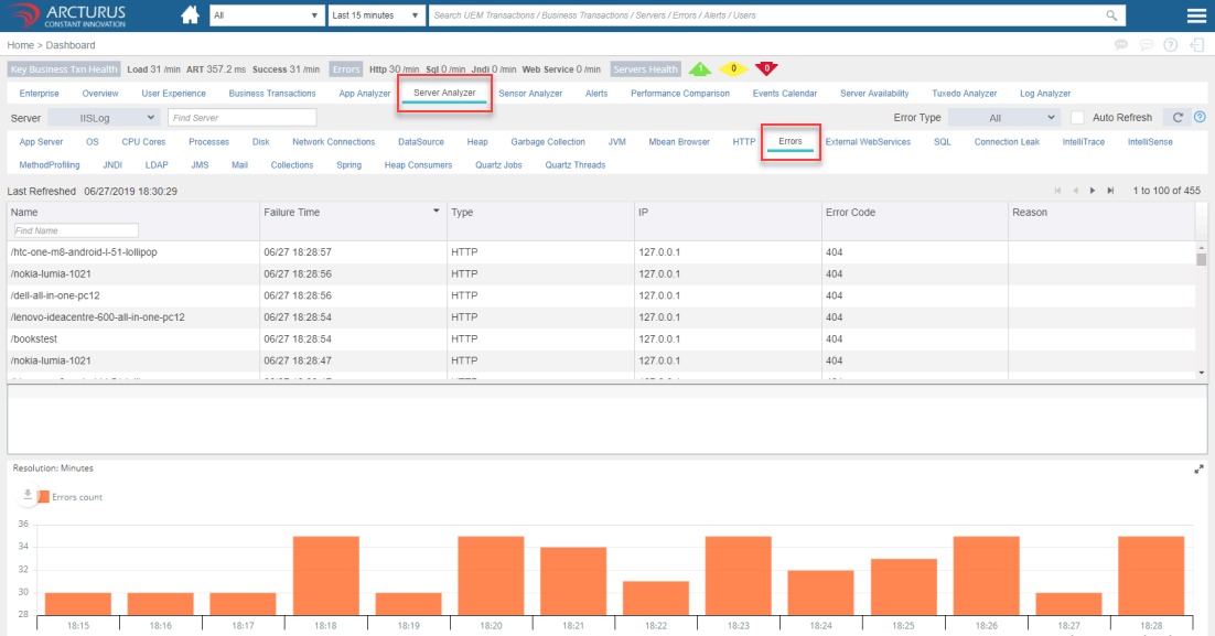 HTTP Errors shows URI, failure time, http error code, exception and IP address where the call came from.