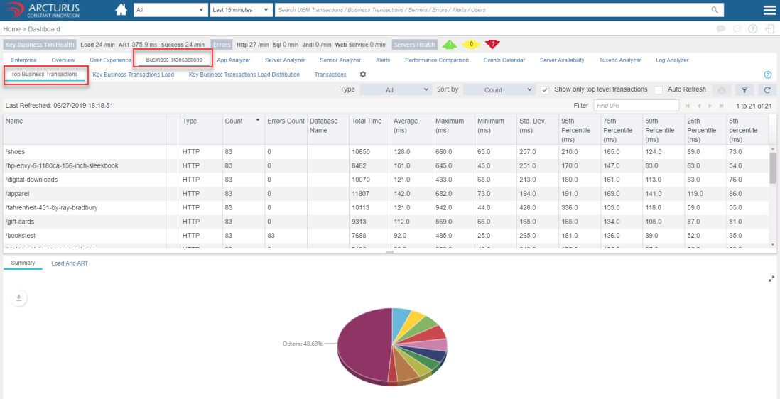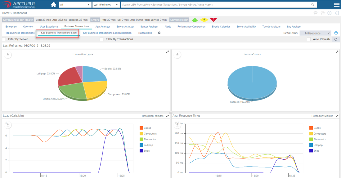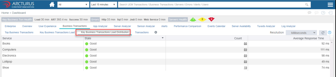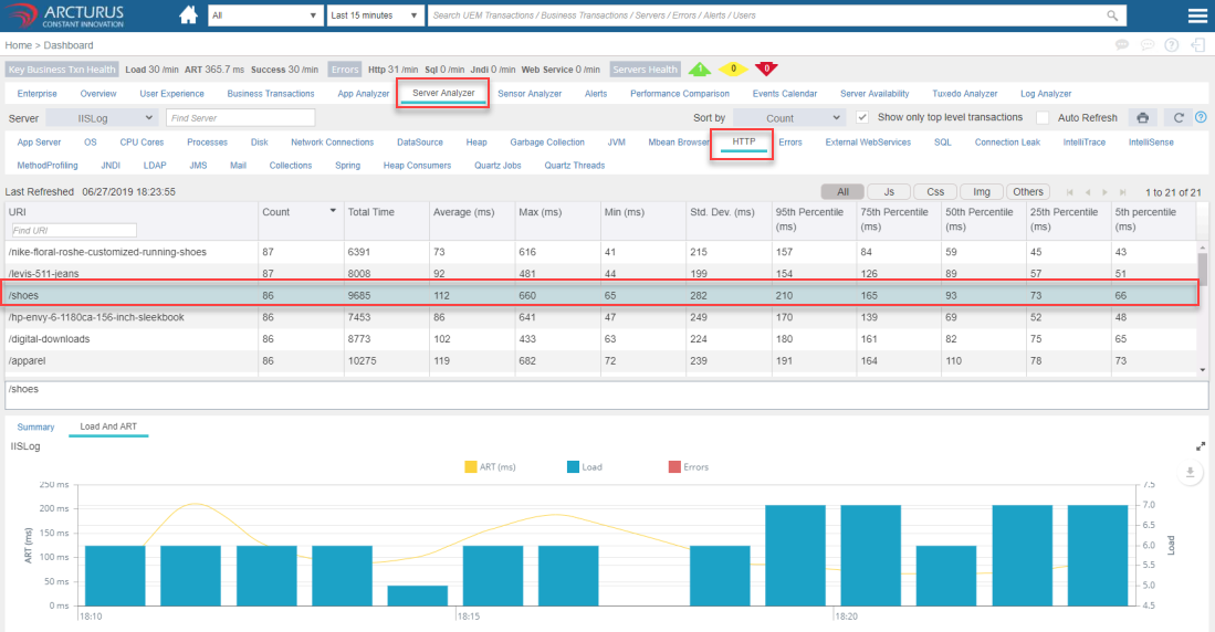 Using the KBT tab you can view the performance stats of key business transactions across the environment as well as on a per server basis.