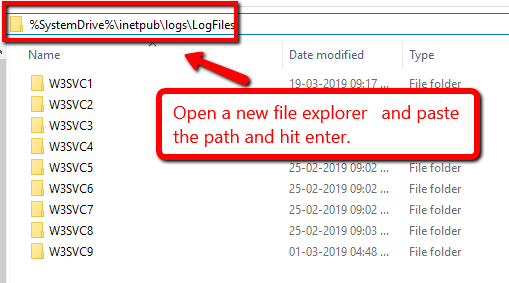 - Copy "%SystemDrive%\inetpub\logs\LogFiles" path and open a file explorer and paste that path in the address bar and hit enter.