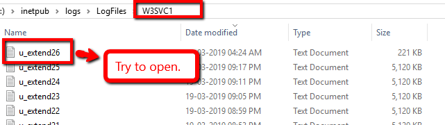 2. Go to the IIS Log folder path and open the "W3SVC1" folder (i.e "W3SVC" + "ID of the site". Here the Default Web Site id is "1". So we need to check the "W3SVC1" folder). Inside the folder please make sure that we have access to all the files.