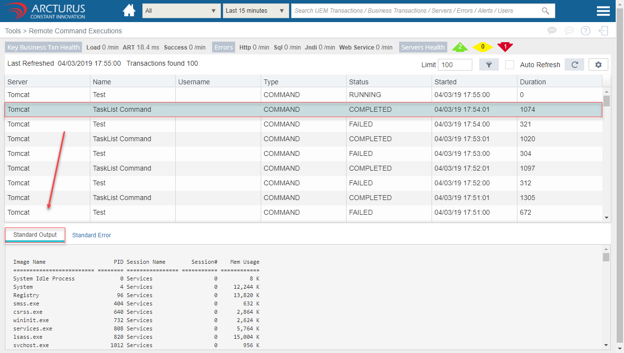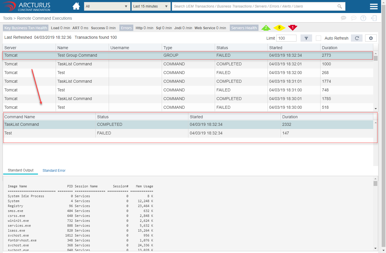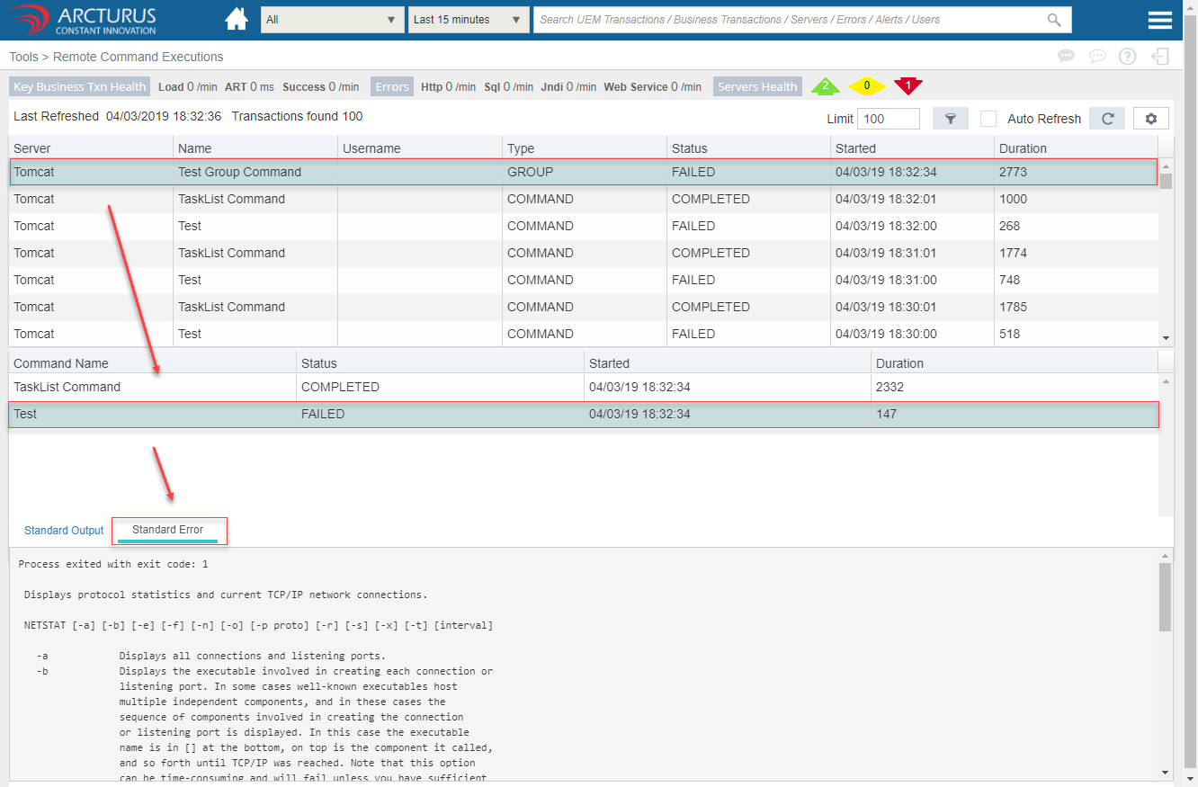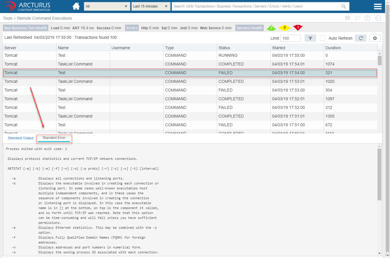 Select the command from the grid to view the Standard output or error for that particular command.