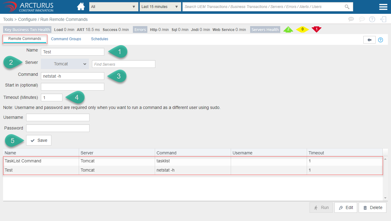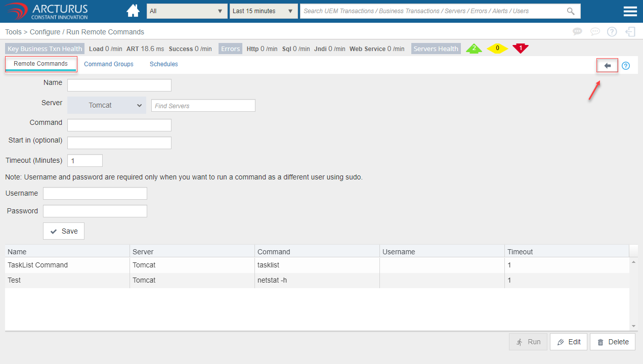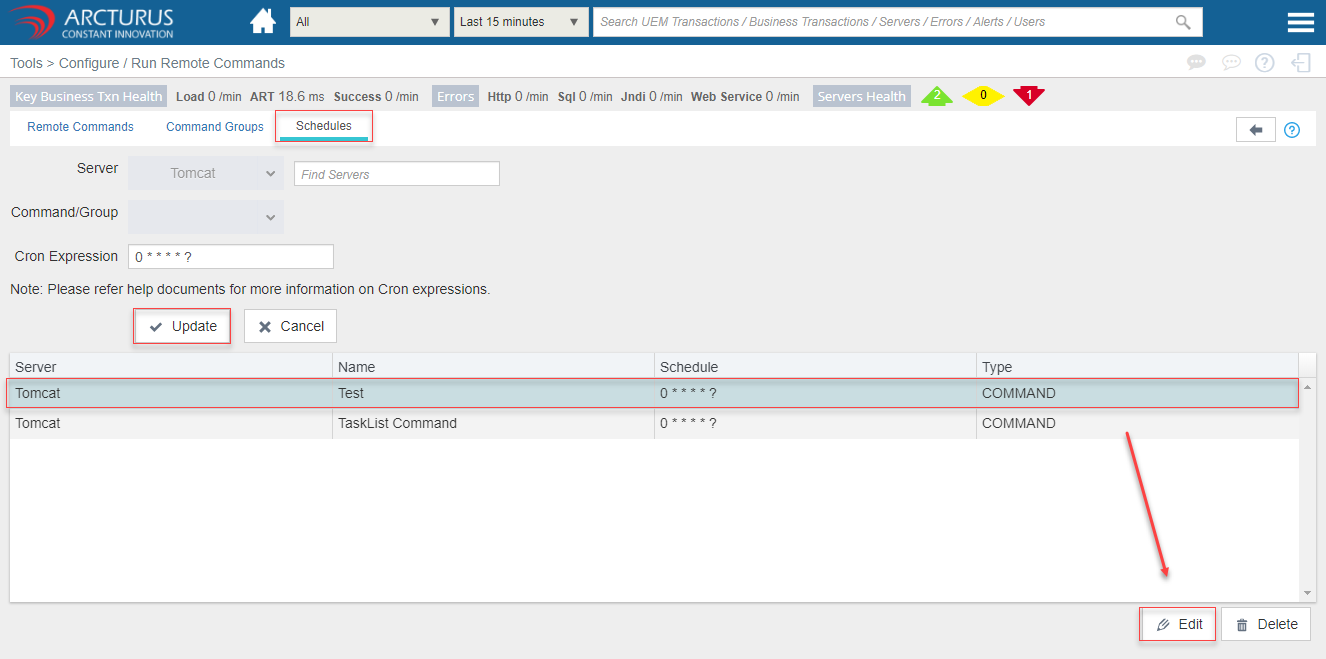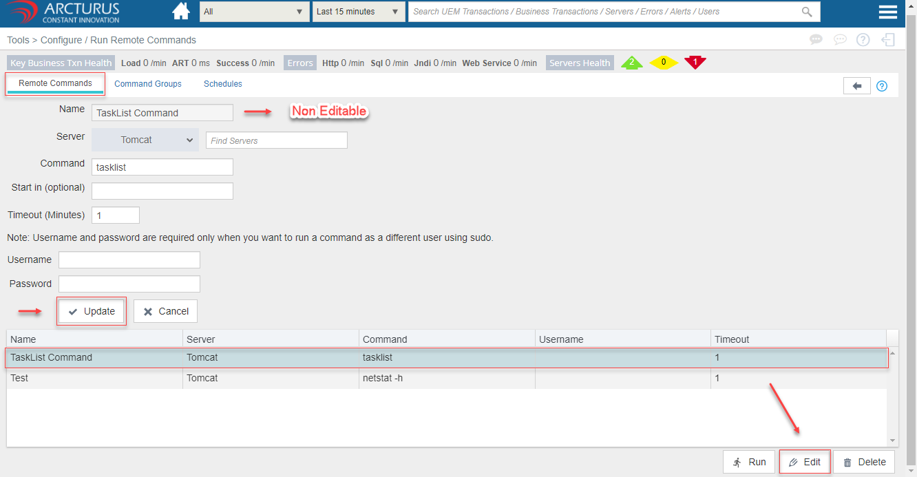 - Select the row from the command grid and click the "Edit" button to edit the command details.
