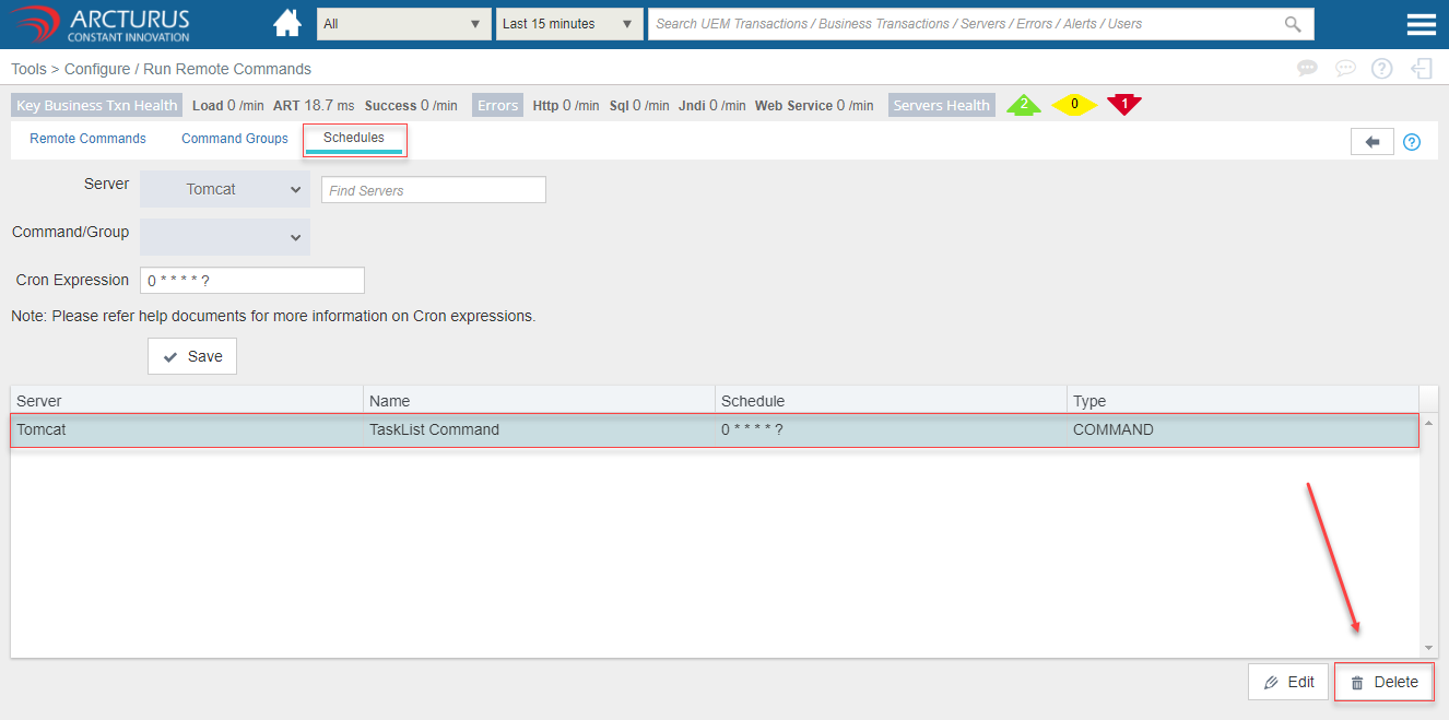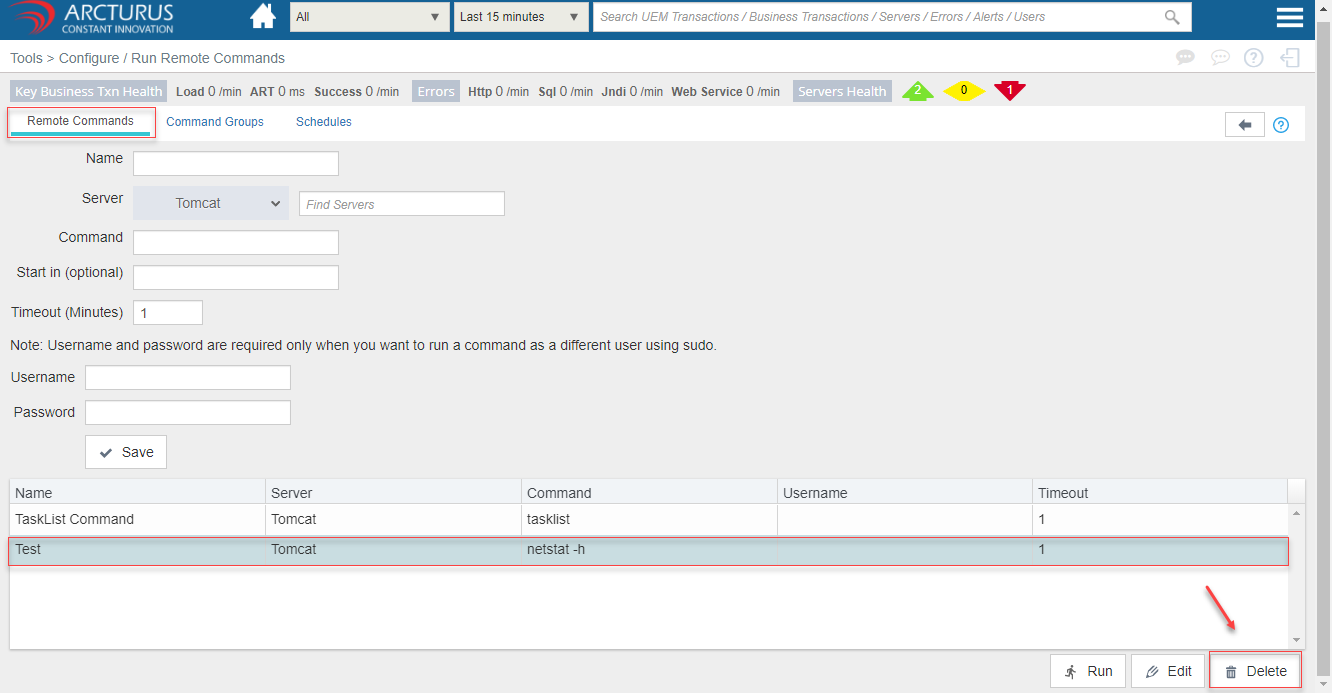 - Select the row from the command grid and click the "Delete" button to delete the command.