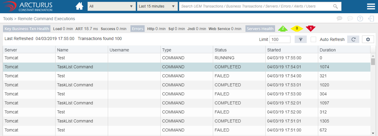 Select the command from the grid to view the individual results.