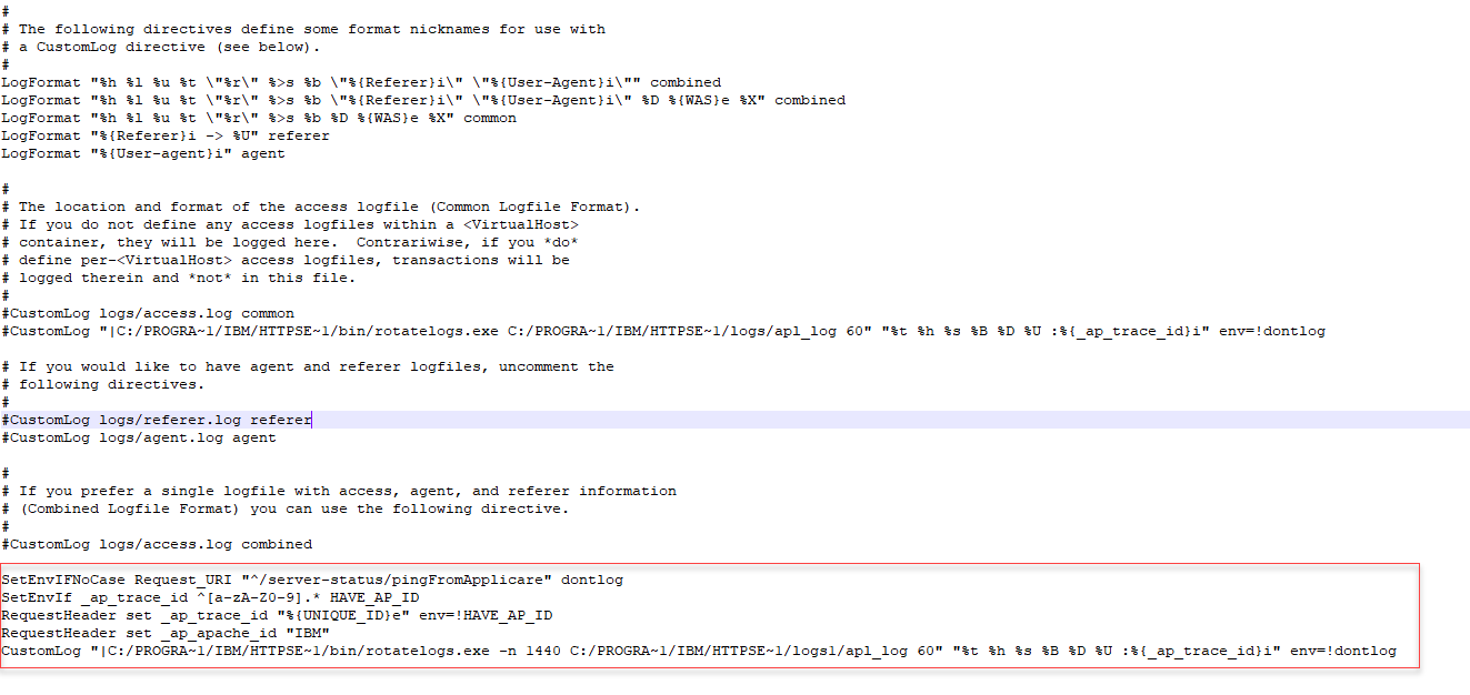 - CustomLog "|<IBMHTTPHomeDir>/bin/rotatelogs <IBMHTTPHomeDir>/newlogfolder/apl_log 60" "%t %h %s %B %D %U :%{_ap_trace_id}i" env=!dontlog