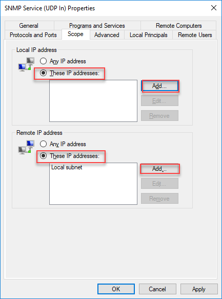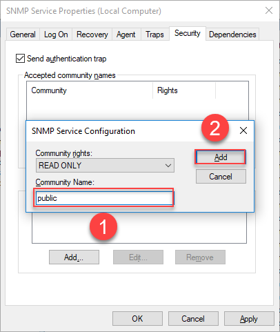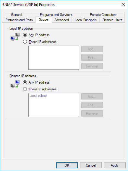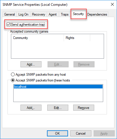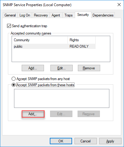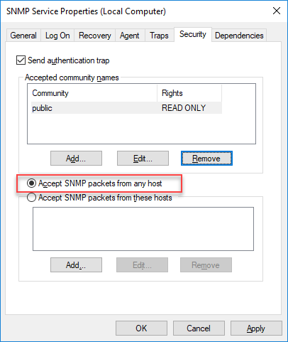 - We can select either “Accept SNMP packets from any host” or “Accept SNMP packets from these host” options.