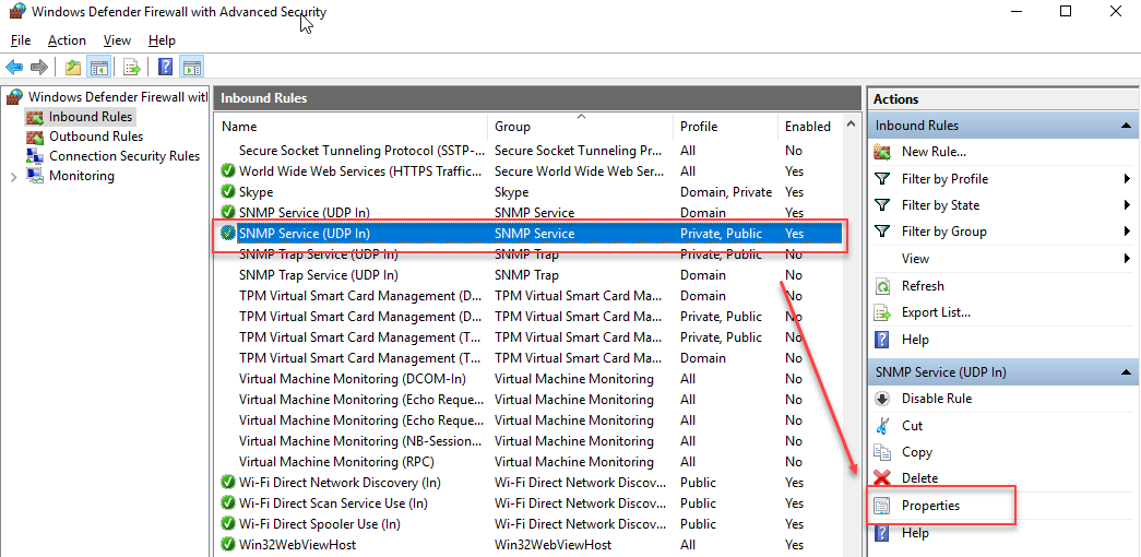 23. Select “Properties” for the “SNMP Service (UDP In)”.