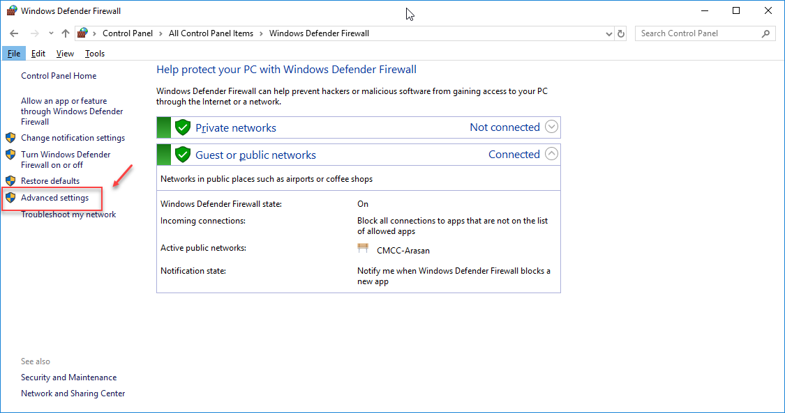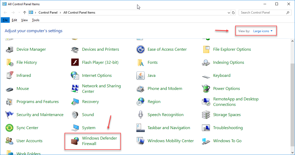 20. Select “Large icons” in the view by drop-down and Select the “Windows Defender Firewall”.