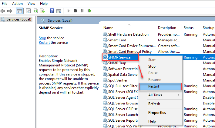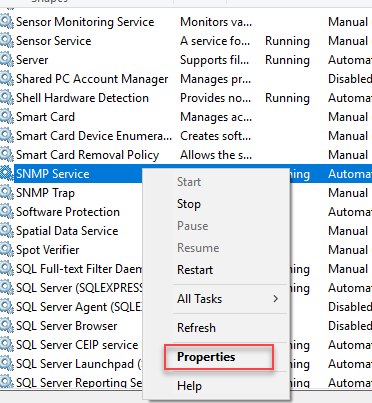 9. Search for “SNMP Service” you will see the SNMP service is running.