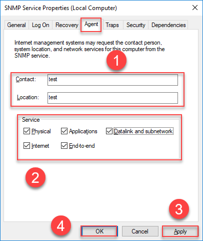 15. Go to Agent tab. Enter the Contact and Location names. Select all the check-boxes in the “Service” field and click the “Apply” and “OK” button.