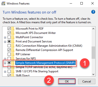 4. Check the “Simple Network Management Protocol (SNMP)” checkbox and select “OK” button.