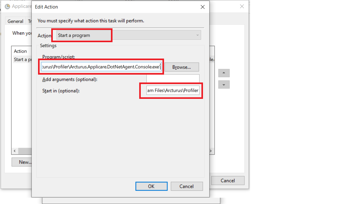 - In the start in option: Enter the <DOTNET_AGENT_INSTALLED_PATH>\Profiler folder path. Default is C:\Program Files\Arcturus\Profiler
