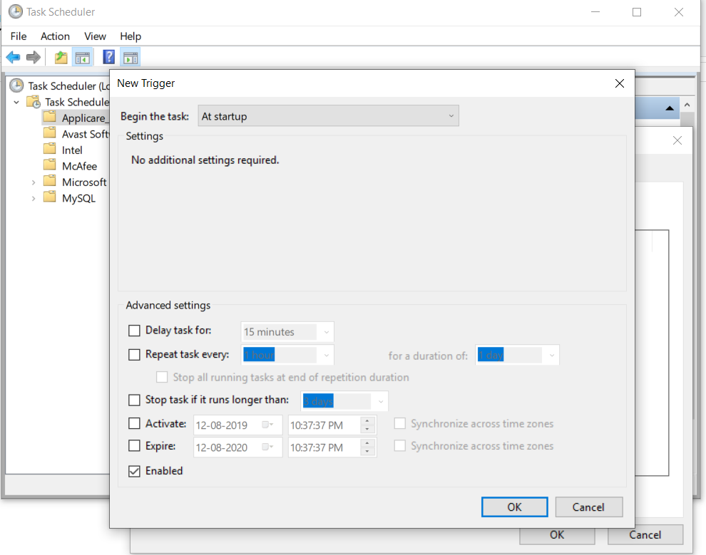 - Select “At startup” option from the "Begin the task" drop-down menu.