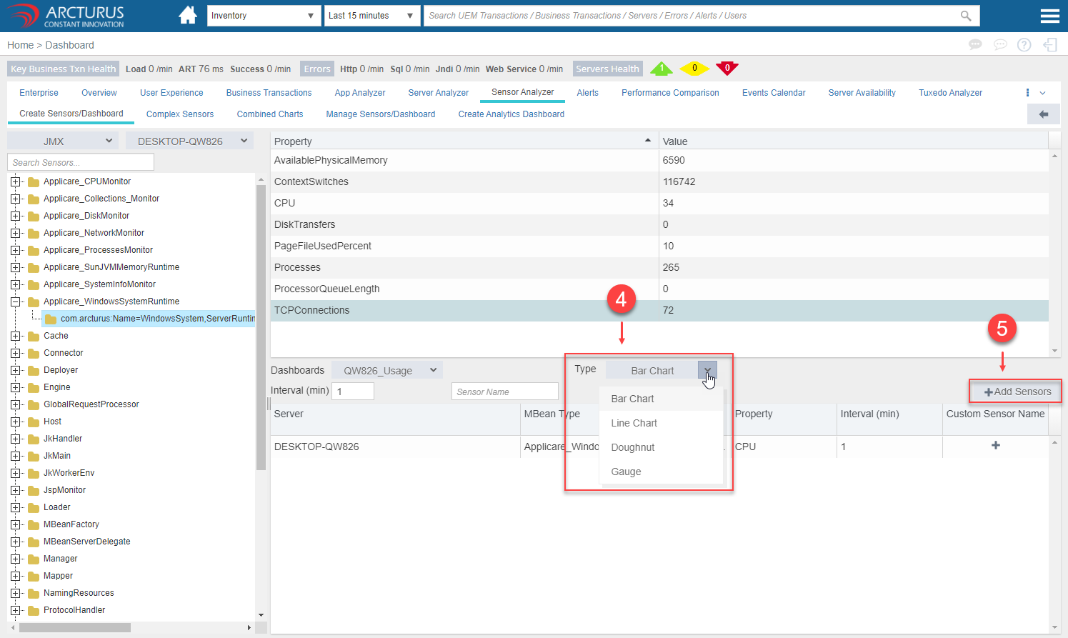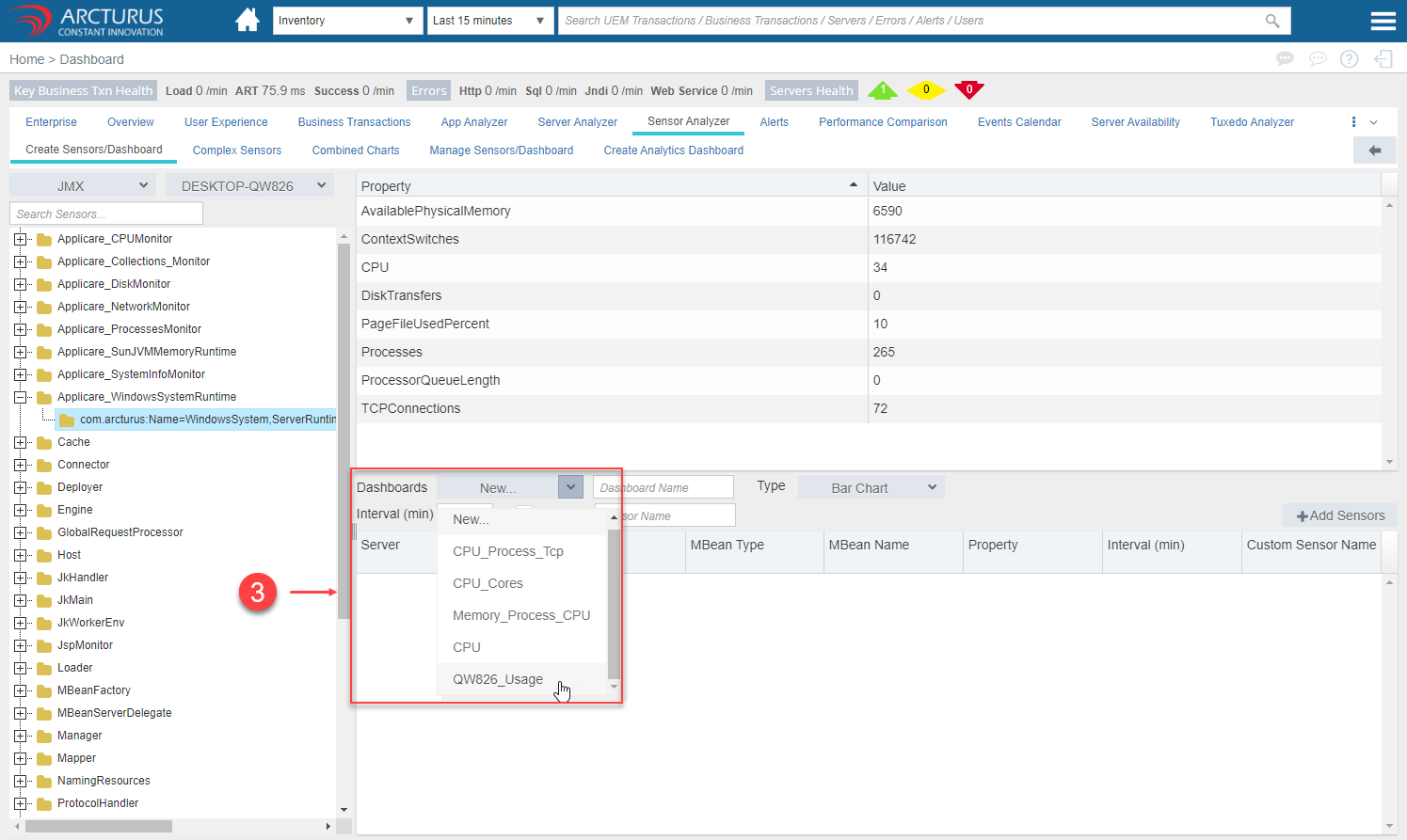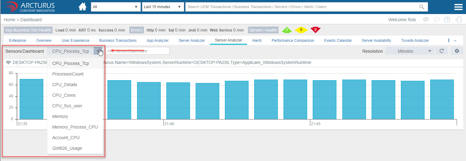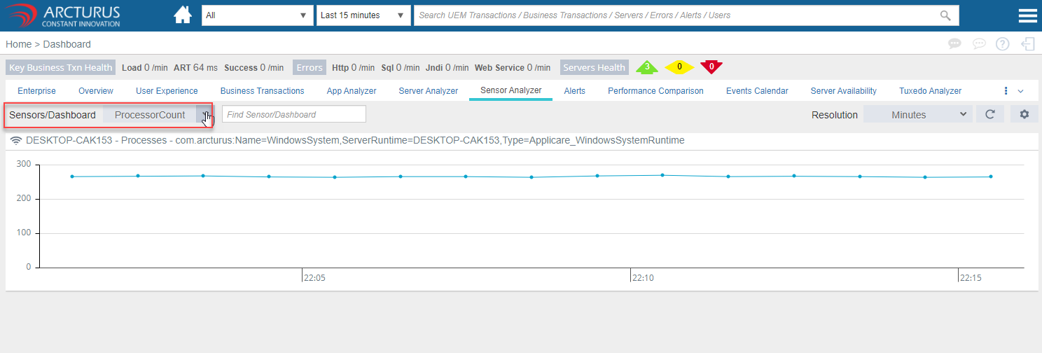 Select the dashboard from the Sensors/Dashboard drop-down to view.