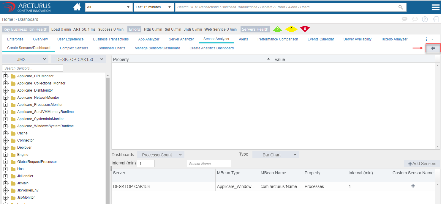 To Create a Sensors Dashboard in the Applicare console, go to Sensor Analyzer -> Click on Settings Button (Wheel Icon) in the right corner.