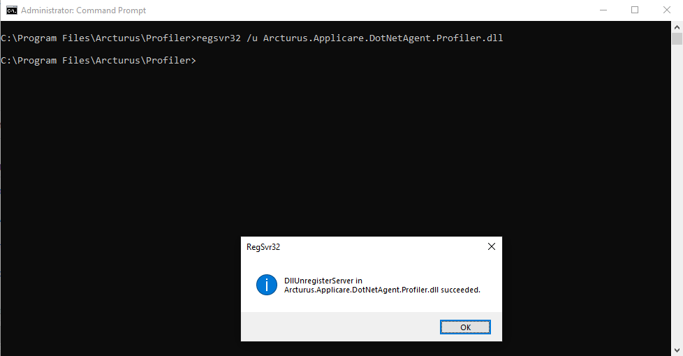 5 - Run the cmd - regsvr32 /u Arcturus.Applicare.DotNetAgent.Profiler.dll from the path <AGENT_HOME>. (We can ignore this step if it fails.)