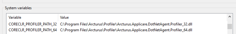 CORECLR_PROFILER_PATH_32 : <Agent_Installed_Path>\Profiler\Arcturus.Applicare.DotNetAgent.Profiler_32.dll